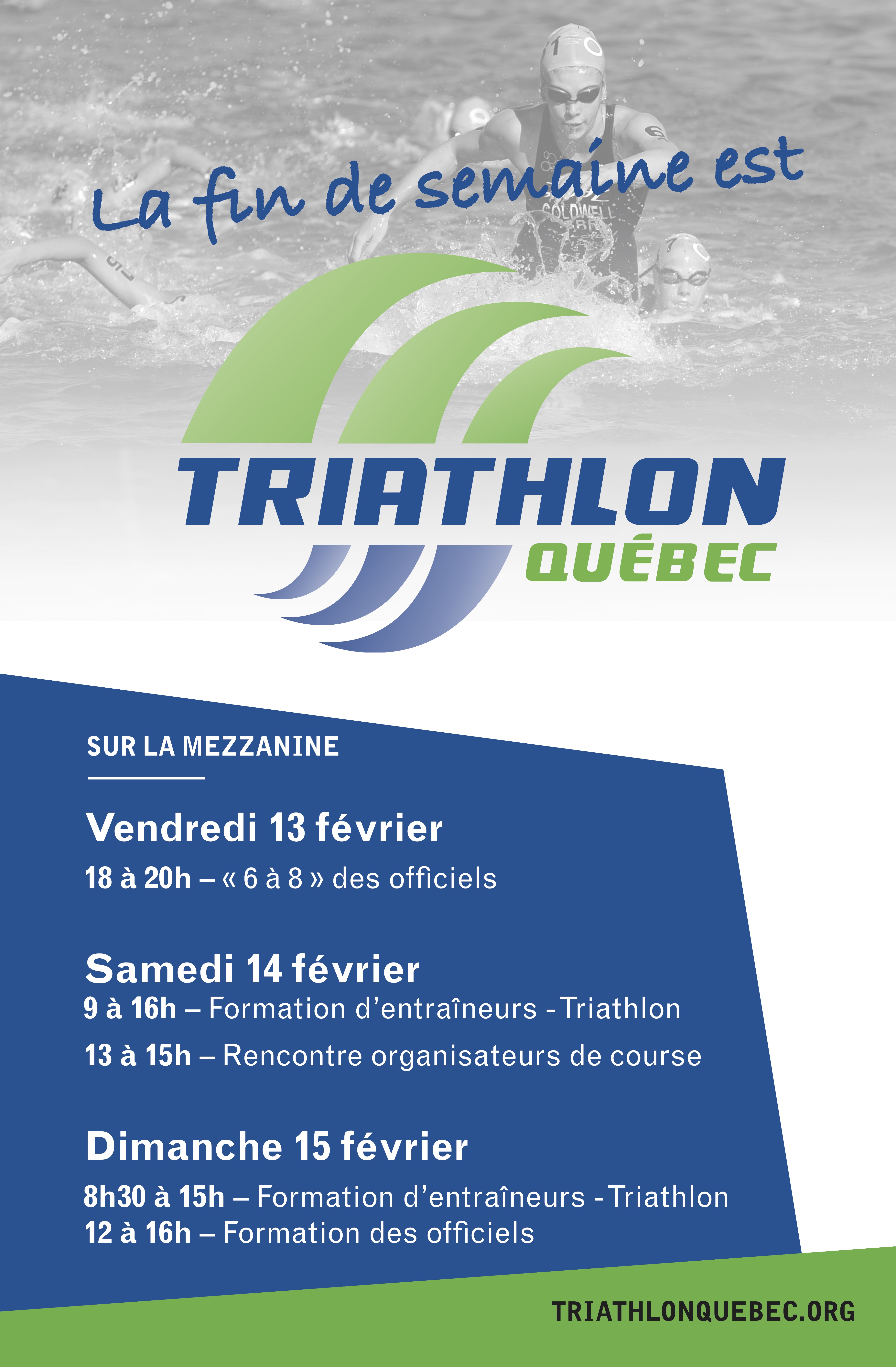 Pour Québec, ce sera la fin de semaine du 25 et 26 avril, aux Galeries de la Capitale. Ce tout nouveau Salon, le Salon de la Course à Pied et du Triathlon de Québec, est organisé par de véritables passionnés de course à pied et de triathlon. On y attend des conférenciers de très grande qualité, et toute une série d’exposants en triathlon, incluant clubs et événements. La programmation pour le triathlon va se monter dans les prochaines semaines, nous vous tiendrons informés, mais vous pouvez d’ores et déjà ajouter ces dates à votre agenda! Triathlon Québec, plusieurs clubs et événements seront présents, et nous voyons à organiser des formations et rencontres en marge. Et l’entrée sera gratuite!