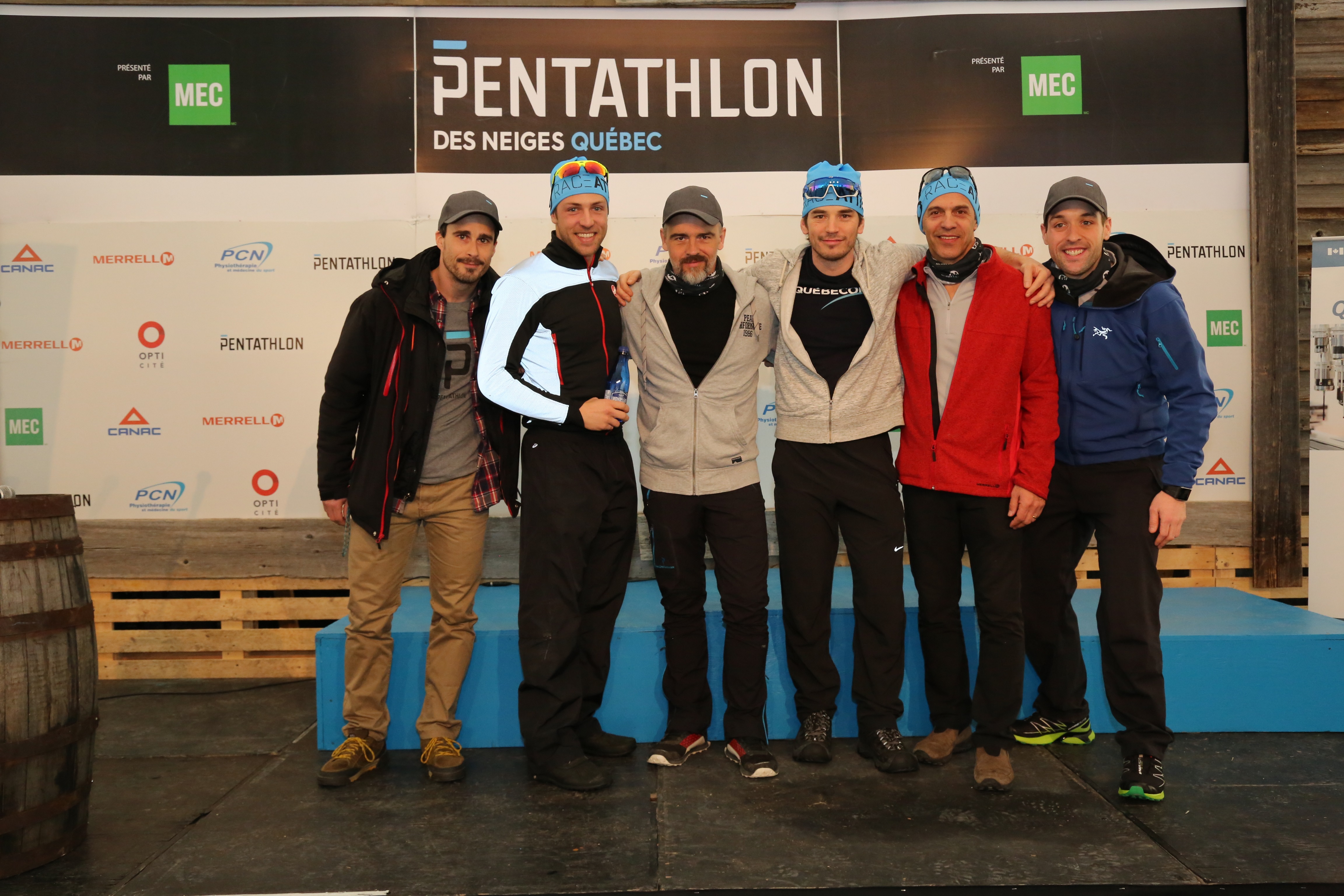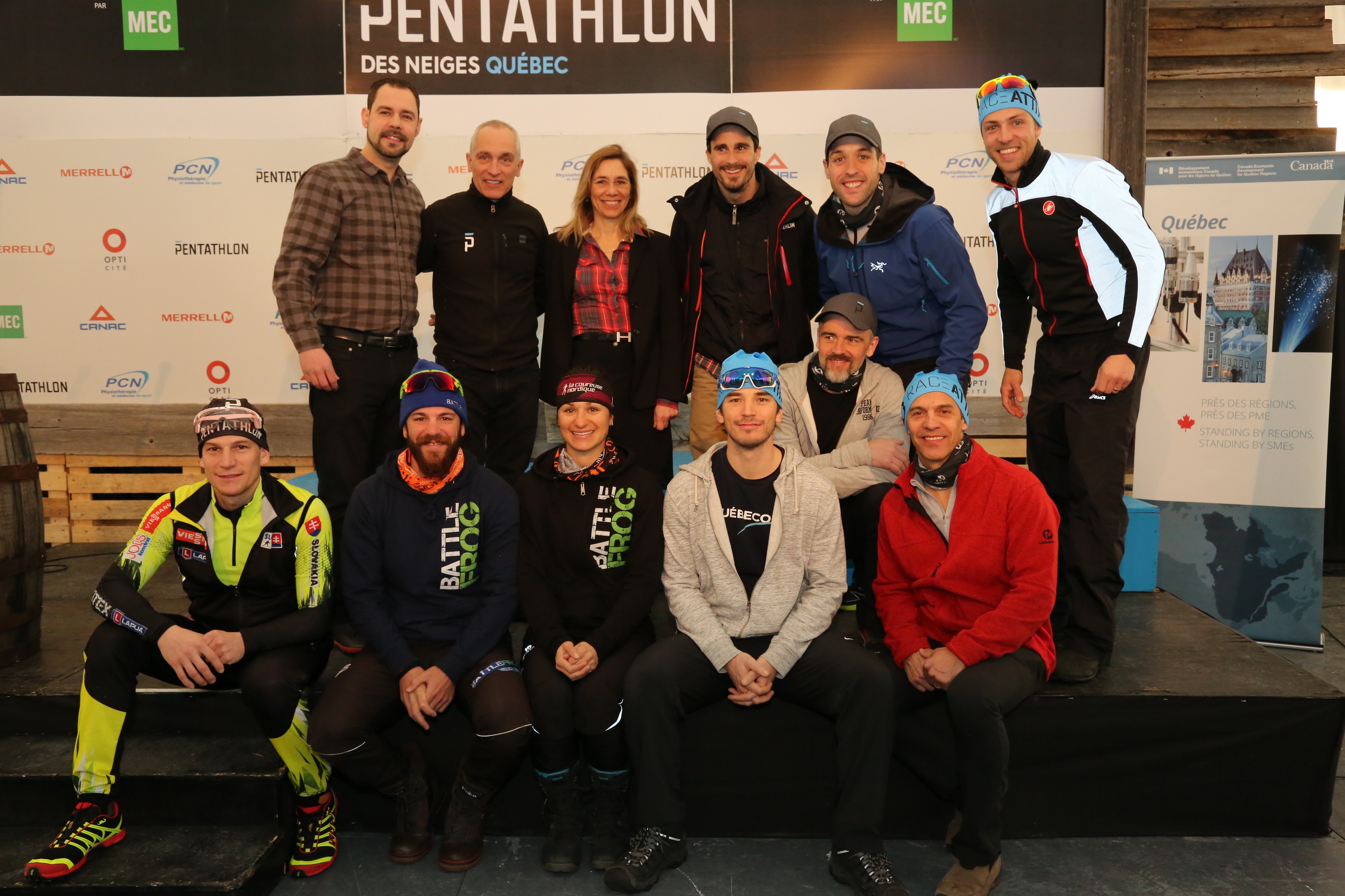 La famille. Rangée du bas : Dusan Simocko, de la Slovaquie, Marc-André Bédard, du Canada (Québec), Claude Godbout, du Canada (Québec), Sébastien Delorme – patin – comédien, Patrice Godin – course – comédien, Serge Dessureault – ski de fond – pompier participant à l’émission Alerte 5. Rangée du haut : Jonathan Labonté, directeur Régional de l’Est du Canada de Mountain Equipment Co-op (MEC), François Calletta, directeur général du Groupe Pentathlon, Louise Martineau, conseillère principale, au bureau d’affaires de Développement économique Canada pour les régions de Québec et Chaudière-Appalaches, Patrick Hivon, comédien et porte-parole du Pentathlon des neiges, Jimmy Sévigny – raquette – entraineur conférencier, David Veilleux – vélo – le seul québécois à avoir participé et complété le Tour de France en 2013