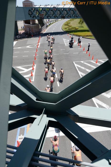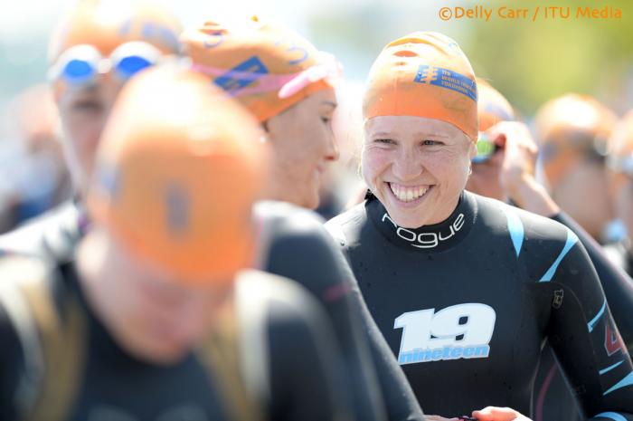 Étant donné qu’il manquait quelques troupes à l’appel pour Yokohama, j’ai choisi ma position de départ en 4ième, ce qui m’a laissé l’embarras du choix! Finalement, la position 44 a été de bon augure, me laissant un excellent départ ou j’ai assuré une bonne position durant le premier tour dans le port. Le deuxième tour fut légèrement plus corsé, et j’ai dût utiliser toutes mes réserves de volonté physique et mentale afin de conserver ma position chèrement acquise. Mes efforts ont portés fruit, et m’ont permis de me retrouver dans le premier peloton, avec environ 16 autres des meilleures nageuses du circuit.