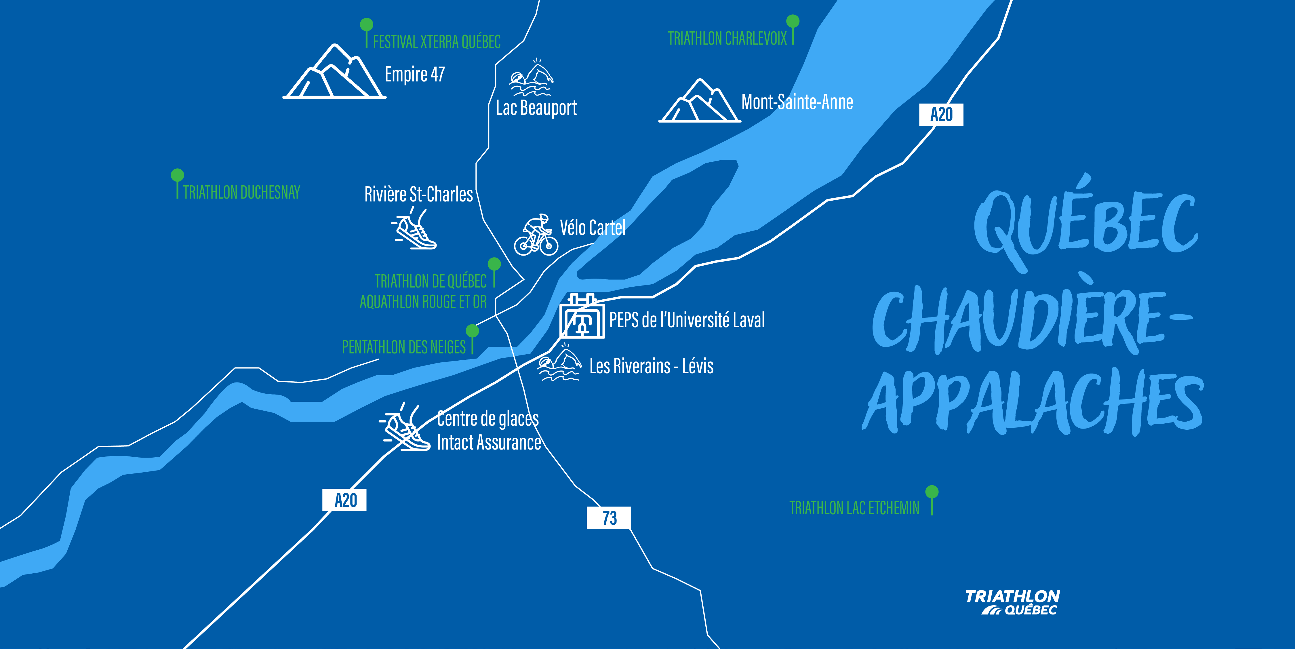 À travers ces deux grandes régions, les possibilités pour s’entraîner et prendre part à un événement sont aussi variées que nombreuses! Peu importe la saison, vous pouvez profiter des différentes installations sportives et sites extérieurs pour vous adonner à la pratique de vos disciplines favorites. En plus, la région regorge d’attraits touristiques, comme les chutes Montmorency, le Château Frontenac, l’Île d’Orélans, le Zoo Miller et le Woodooliparc!