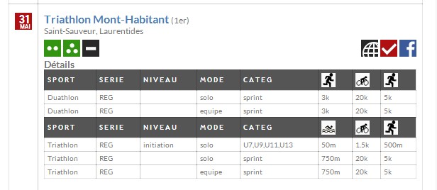 Le Triathlon Sports Experts du Mont Habitant, organisé par Événements Topchrono, aura lieu en tout début de saison, le samedi 31 mai 2014. Au programme,  un triathlon et un duathlon, à faire seul ou en relais,  ainsi qu’une course familiale pour les enfants. Visitez le calendrier pour obtenir tous les détails et vous inscrire.TriMontHabitantCal